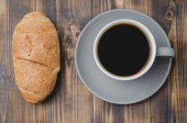 Przerwa na kawę z nożem do masła croissanta i filiżanką czarnej kawy