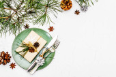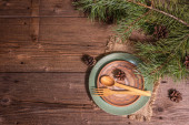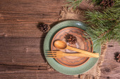 Ustawienie świątecznego i noworocznego obiadu. Słodka przekąska, gałąź jodły, świece, szyszki, ceramiczne talerze, widelec i nóż. Sztućce zimowe drewniane tło