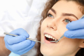 Zbliżenie twarzy kobiety poddanej badaniu detntystycznemu
