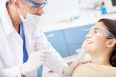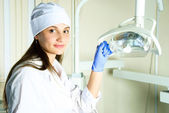 Urocza kobieta siedzi na fotelu stomatologa i poddaje się kontroli. Skupienie selektywne.