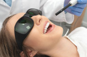 Blondynka w czarnych okularach badana przez stomatologa z Uv. Skupienie selektywne.