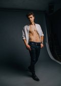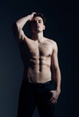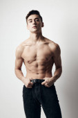 mięśnie silny piękny stripped mężczyzna model w dżinsy czarny dżinsy na czerwony izolowane czcionki tło