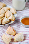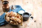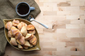 Domowe ciasteczka z serem wiejskim w ceramicznej misce i miedzianym cezve kawy na drewnianym tle