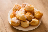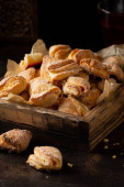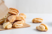 Talerz z domowymi ciasteczkami z serem wiejskim na ciemnym tle.