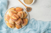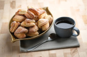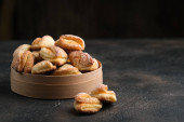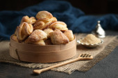 Domowe ciasteczka z serem wiejskim w rustykalnej misce na ciemnym tle.