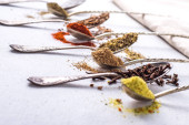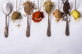 Zdjęcie "Różne przyprawy mielone kurkuma pieprz imbir cynamon zioło przyprawy sól papryka kminek nasiona vintage łyżka na stole. Widok z góry. indyjskie przyprawy na białym tle" może być wykorzystywane do celów osobistych i komercyjnych zgodnie z warunkami zakupionej licencji Royalty-free. Obraz jest dostępny do pobrania w jakości wysokiej rozdzielczości do 5760x3840.