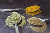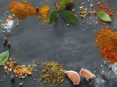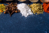 Zdjęcie "Różne przyprawy mielone kurkuma pieprz imbir cynamon zioło przyprawy sól papryka kminek nasiona vintage łyżka na stole. Widok z góry. indyjskie przyprawy na ciemnoniebieskim tle" może być wykorzystywane do celów osobistych i komercyjnych zgodnie z warunkami zakupionej licencji Royalty-free. Obraz jest dostępny do pobrania w jakości wysokiej rozdzielczości do 5760x3840.