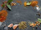 Różne przyprawy mielone kurkuma pieprz imbir cynamon zioło przyprawy sól papryka kminek nasiona vintage łyżka na stole. Widok z góry. indyjskie przyprawy na ciemnoniebieskim tle