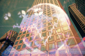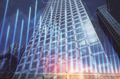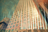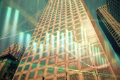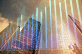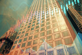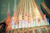 Forex wykres na miejskim krajobrazie z wysokich budynków tle wielu ekspozycji. Koncepcja badań finansowych.