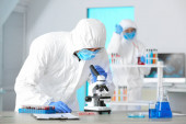 panoramiczne ujęcie wielokulturowych naukowców robiących testy DNA w laboratorium