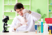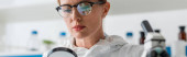 panoramiczne ujęcie biologa trzymającego całe jabłko w laboratorium