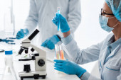selektywne skupienie uwagi biologa korzystającego z mikroskopu i afrykańskiego kolegi posiadającego lupę