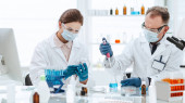 Afrykański biolog patrzący na liście ze szkłem powiększającym i kolegą trzymającym probówkę