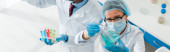 panoramiczne ujęcie afrykańskiego biologa patrzącego na liście ze szkła powiększającego i kolegę trzymającego probówkę
