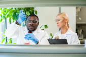 wysoki kąt widzenia biologa patrzącego na probówki i afrykańskiego kolegę z Ameryki używając mikroskopu