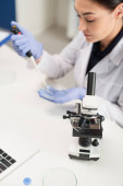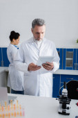 nad głową widok afrykańskiego biologa amerykańskiego za pomocą mikroskopu i kolegi gospodarstwa liści