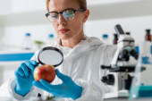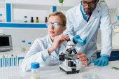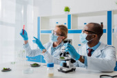 przycięty widok biologa zdejmującego rękawice lateksowe i afrykańskiego kolegę z Ameryki przy użyciu mikroskopu