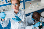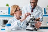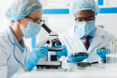wielokulturowi biolodzy w białych fartuchach wykorzystujący mikroskop w laboratorium