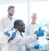 wielokulturowi biolodzy w okularach patrzący na mikroskop w laboratorium