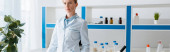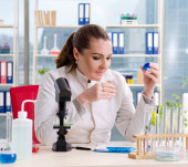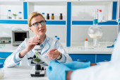 biolog w białym płaszczu patrzący na probówkę z liśćmi