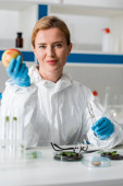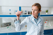 atrakcyjny biolog w białym płaszczu patrzący w laboratorium