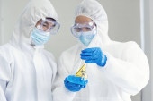 selektywne skupienie się wielokulturowych naukowców wskazujących palcem na test DNA