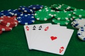 Gra w karty na stosie żetonów pokerowych na zielonym stole