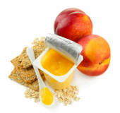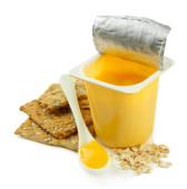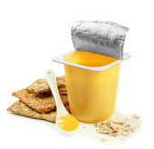 smaczny jogurt w otwartych plastikowy kubek, ciasteczka i owoce, na białym tle