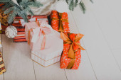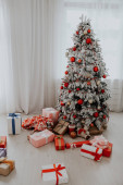 Wnętrze Nowego Roku. Choinka. Święta. Choinka. prezenty i zabawki pod choinką. Zdjęcie z przyciemnianymi