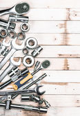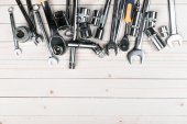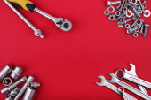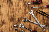 klucze, klucze nasadowe, śruby i nakrętki na ciemnodrewnianej powierzchni z przestrzenią do kopiowania