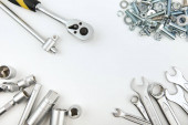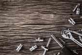 klucze, śruby i nakrętki na ciemnodrewnianej powierzchni z przestrzenią do kopiowania