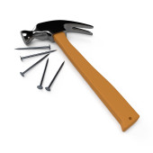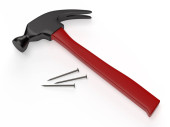 Młot i gwoździe na białej powierzchni. Renderowanie 3D