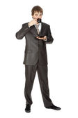 młody biznesmen, siedząc na fotelu i uśmiechał się, mówiąc na