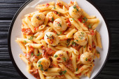 Makaron penne ze smażonymi przegrzebkami, pomidorami, serem i tymiankiem
