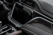 Wnętrze samochodu. Panel z dźwignią zmiany biegów do skrzyni biegów, deski rozdzielczej, kierownicy, skórzanych siedzeń i podłokietników. Strzał w ciemno. Miękkie skupienie