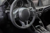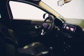 Wnętrze samochodu. Panel z dźwignią zmiany biegów do skrzyni biegów, deski rozdzielczej, kierownicy, skórzanych siedzeń i podłokietników. Strzał w ciemno. Miękkie skupienie.
