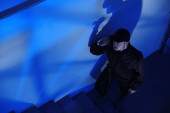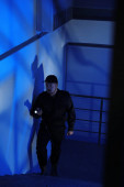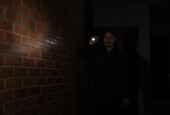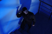 mężczyzna ochrona z latarka idzie w górę schody w ciemności