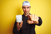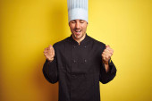 Młody kucharz noszący mundur i kapelusz trzymający patelnię kucharską na odizolowanym żółtym tle z wściekłą twarzą, negatywny znak pokazujący niechęć z opuszczonymi kciukami, koncepcja odrzucenia