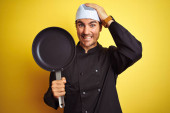 Zdjęcie "Młody kucharz noszący mundur i kapelusz trzymający patelnię kucharską na odizolowanym żółtym tle z wściekłą twarzą, negatywny znak pokazujący niechęć z opuszczonymi kciukami, koncepcja odrzucenia" może być wykorzystywane do celów osobistych i komercyjnych zgodnie z warunkami zakupionej licencji Royalty-free. Obraz jest dostępny do pobrania w jakości wysokiej rozdzielczości do 5760x3840.