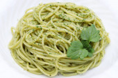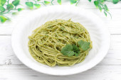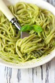 Makaron spaghetti ze świeżymi liśćmi bazylii, śmietaną i serem na stole