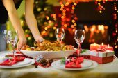 Karp w migdałach, świąteczne danie. Tradycyjne dania świąteczne, świąteczne nakrycia do stołu. Skład horyzontalny.