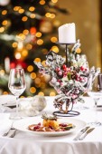 Ryby pieczone w migdałach, eleganckie danie na świątecznym stole. Tradycyjne dania świąteczne, świąteczne nakrycia do stołu. Skład horyzontalny.