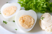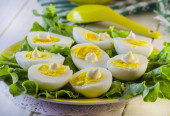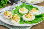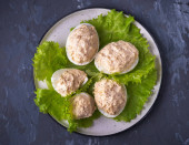 Lekka przekąska z nadziewanych jaj z serem i sosem na liściach sałaty w ceramicznej płytce na szarym stole, widok z boku