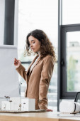 atrakcyjny i uśmiechnięty menedżer rachunków siedzący przy stole i trzymający papiery