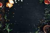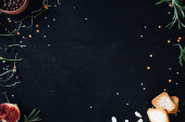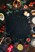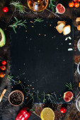 Pełna ramka ze składnikami żywności, przyprawami i przestrzenią kopiującą na tablicy.