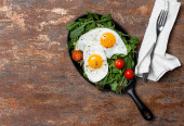 widok z góry na jajka smażone z liśćmi szpinaku, ogórkiem i kiełbasą w patelni na drewnianym stole