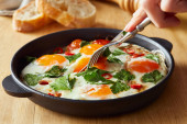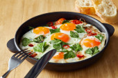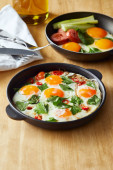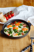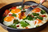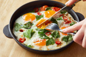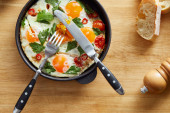 przycięty widok jedzenia jajek smażonych z pietruszką i pieprzem chili na drewnianym stole z widelcem i nożem