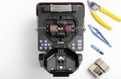 Spawanie kabla optycznego do sieci lokalnej lub Gpon internetowy za pomocą specjalnego narzędzia.