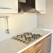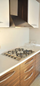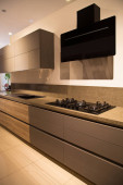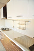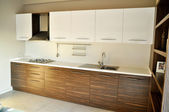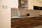 Wnętrze luksusowej nowoczesnej kuchni i orzechów włoskich białych szafek