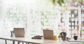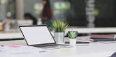 Nowoczesne biuro z wyposażeniem biurowym na stole ze środowiskiem biurowym w tle